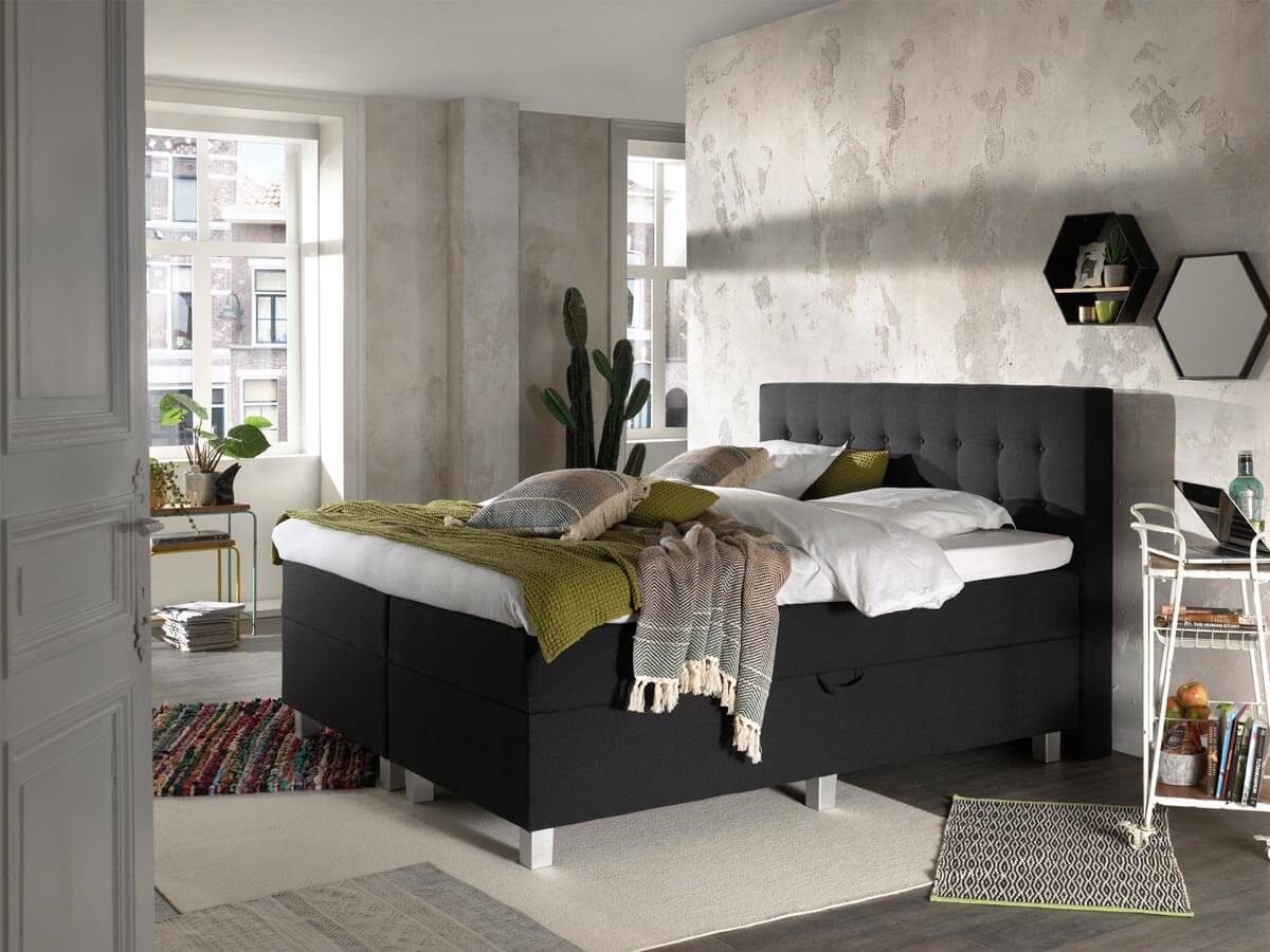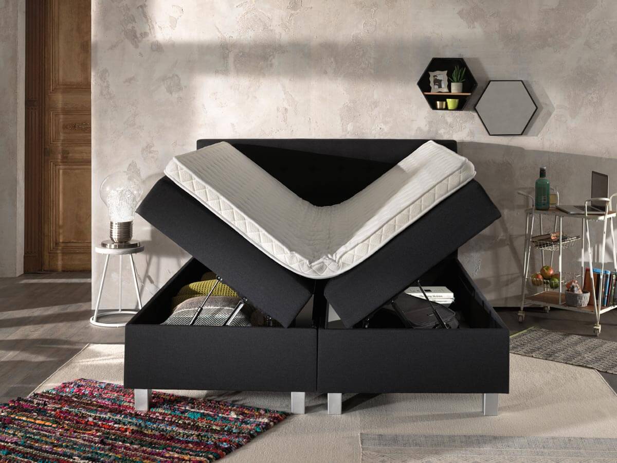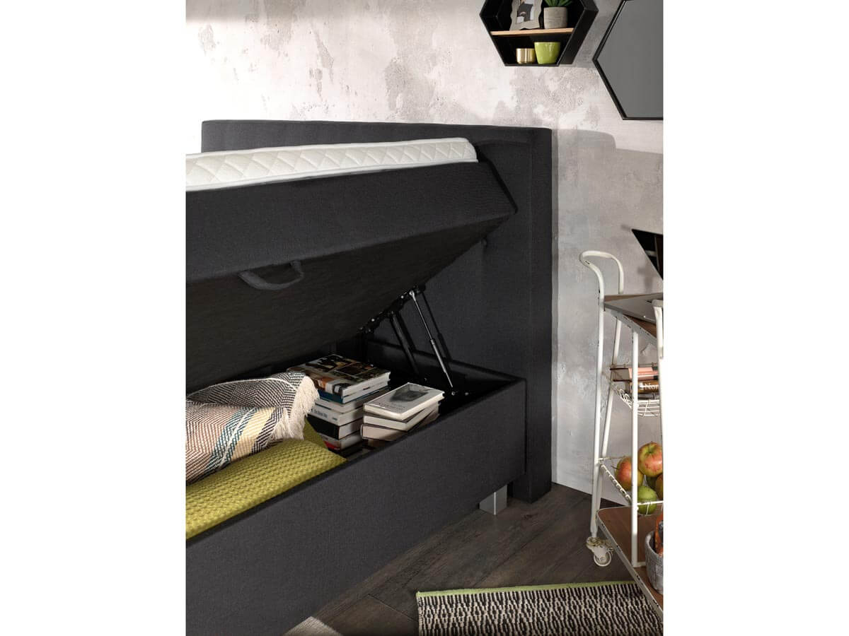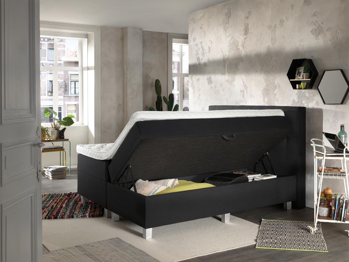De opberg boxspring Shurgard antraciet heeft opbergruimte die zich onder de gehele boxspring bevindt. De ruimte in de boxspring is ideaal om beddengoed, zoals dekens, op te bergen!