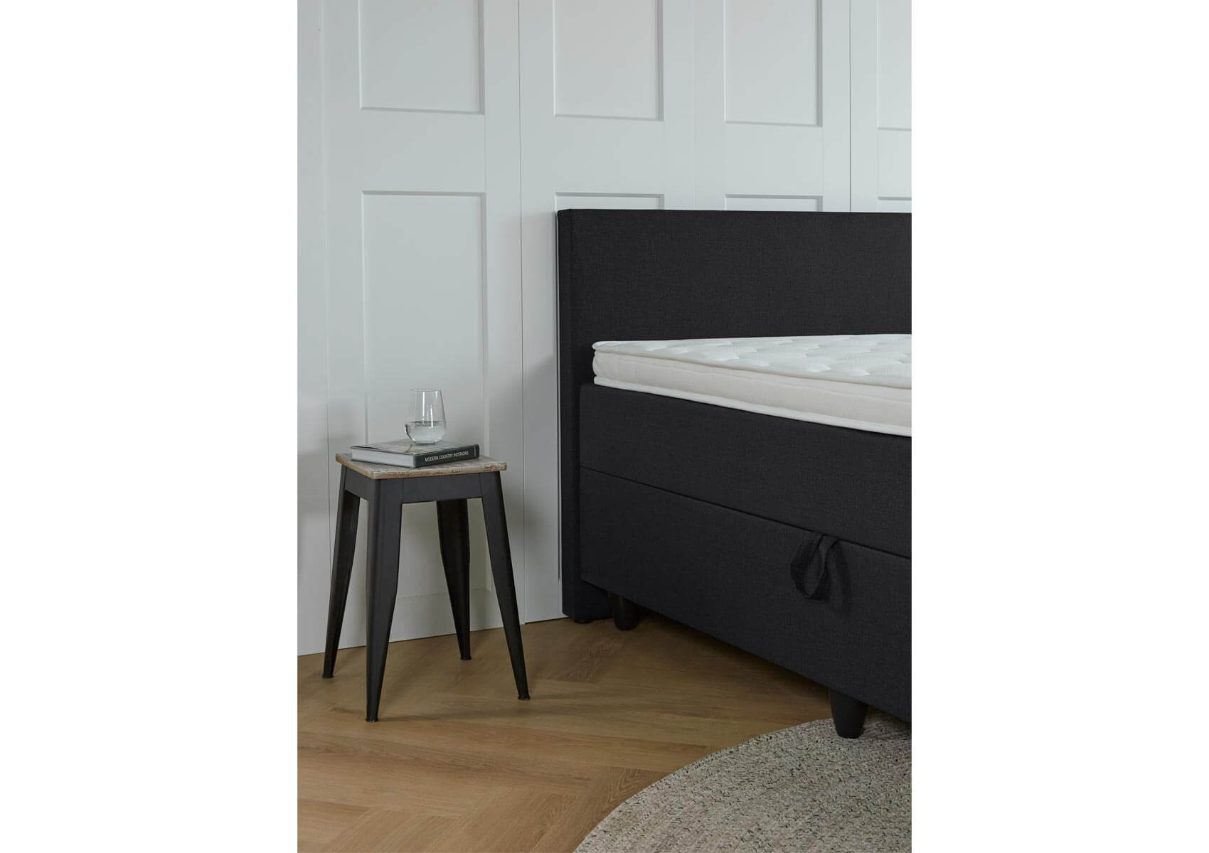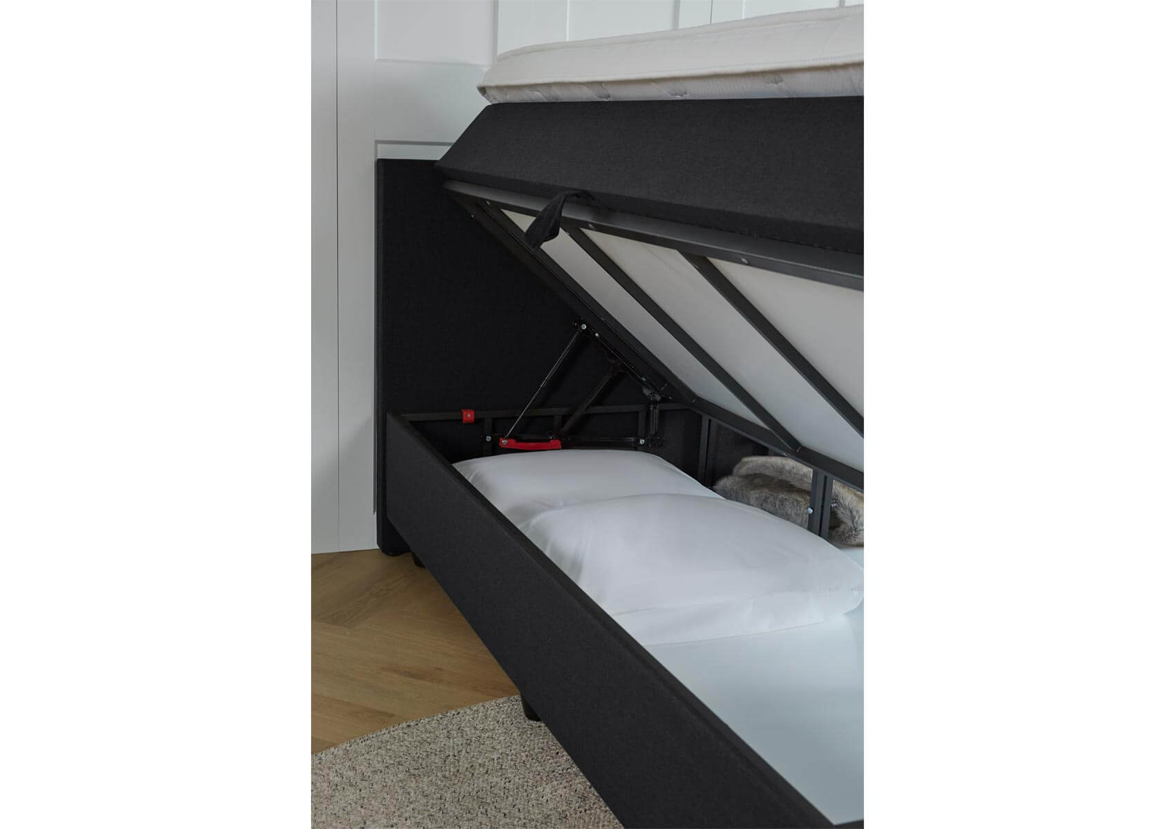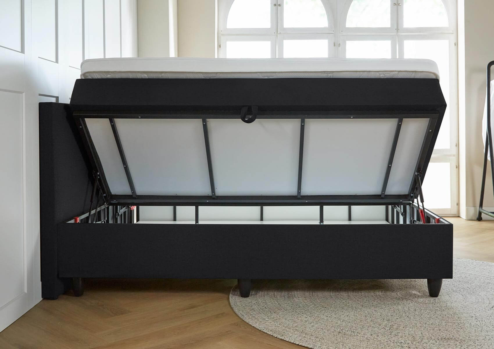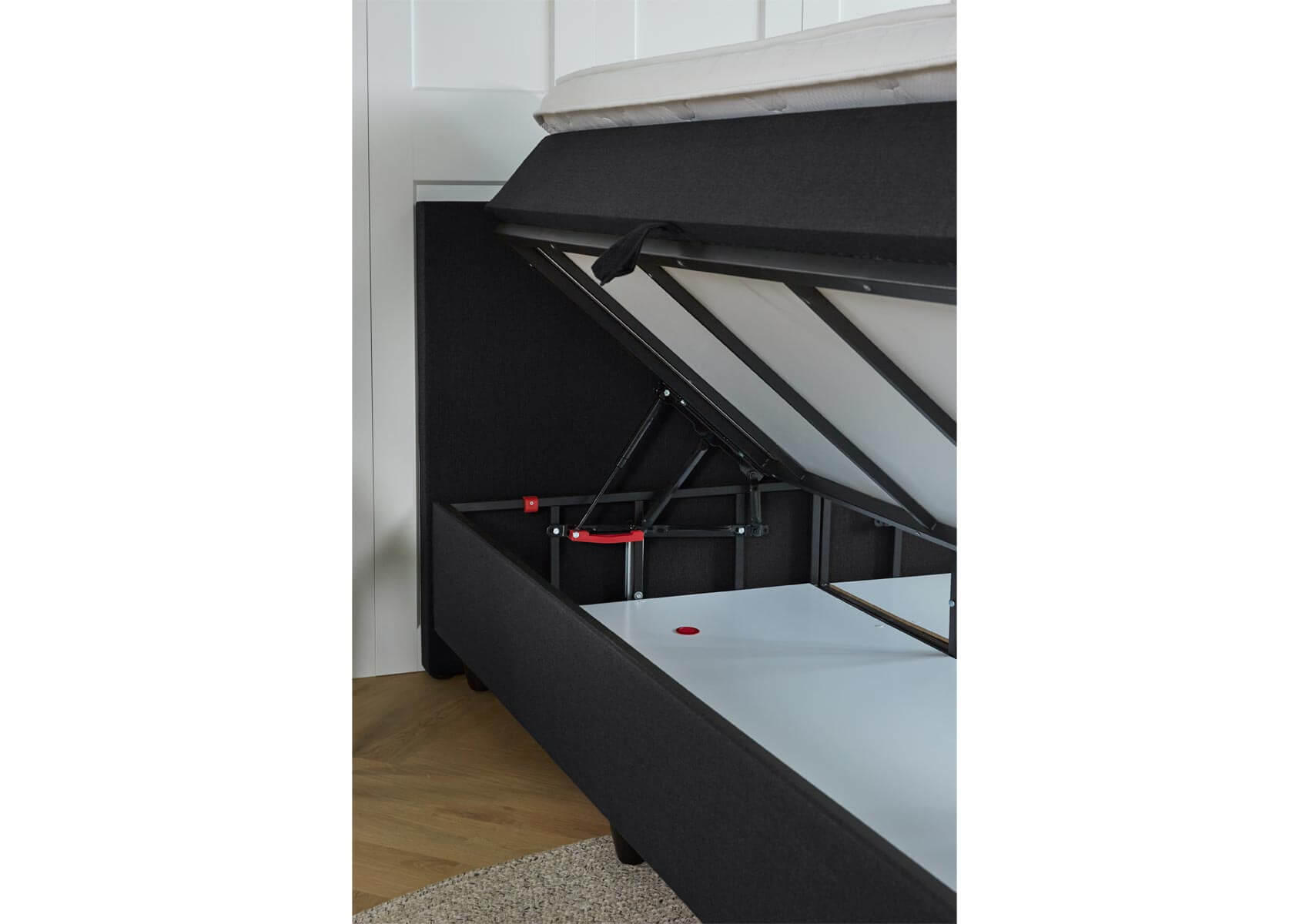 Aan de zijkant van het bed zit een lus. Met deze lus til je de opbergboxspring open. Door het veermechanisme gaat de boxspring heel gemakkelijk open en zal hij ook open blijven staan als je er iets in wilt stoppen of eruit wilt halen. Om de boxspring weer te sluiten, druk je simpelweg het bed naar beneden. Hartstikke makkelijk!